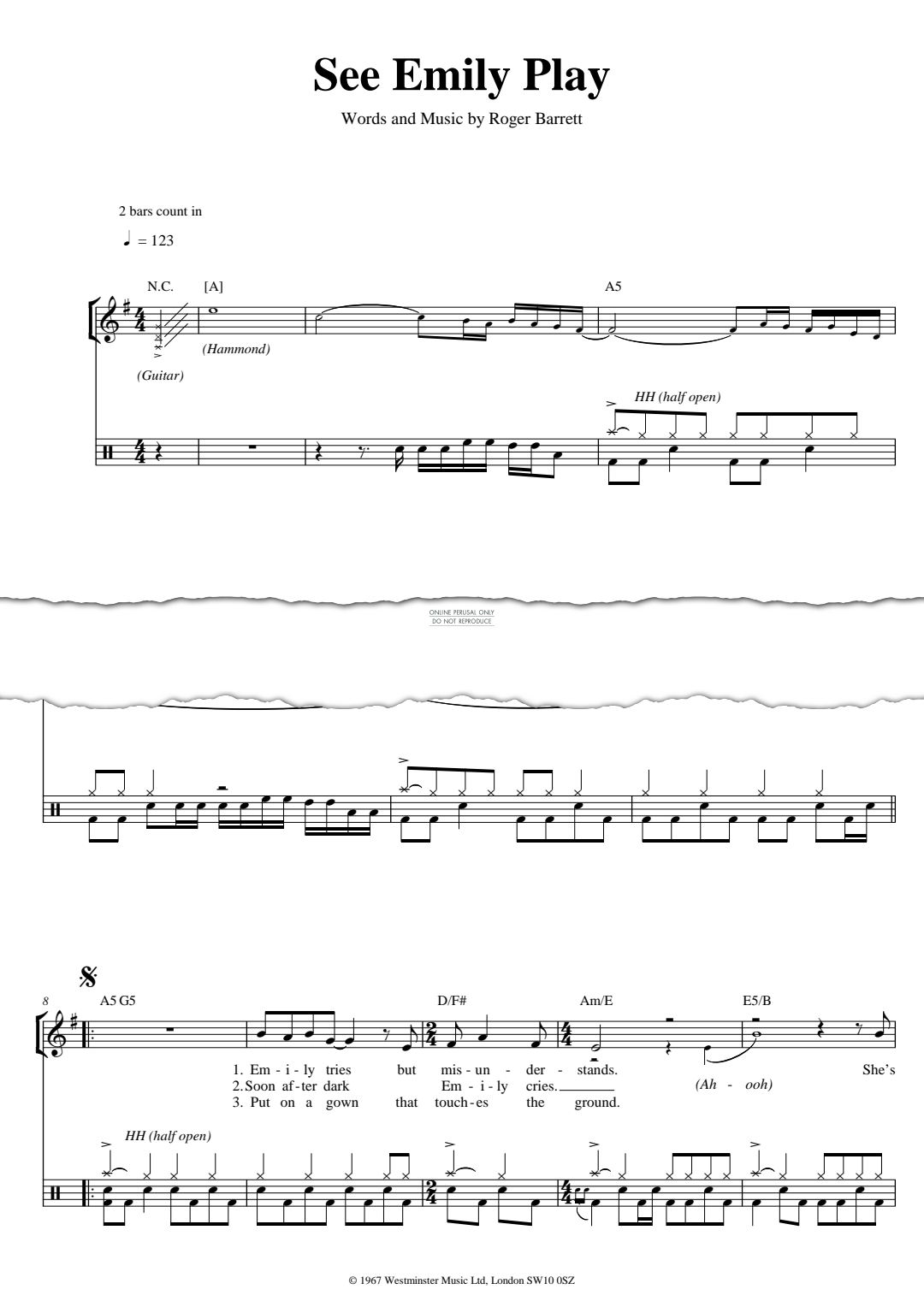 See Emily Play, as recorded by Pink Floyd. Arranged for drums in digital sheet music format.