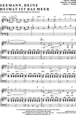 Seemann, Deine Heimat Ist Das Meer - Sheet Music for Voice with Piano Accompaniment Freddy Quinn