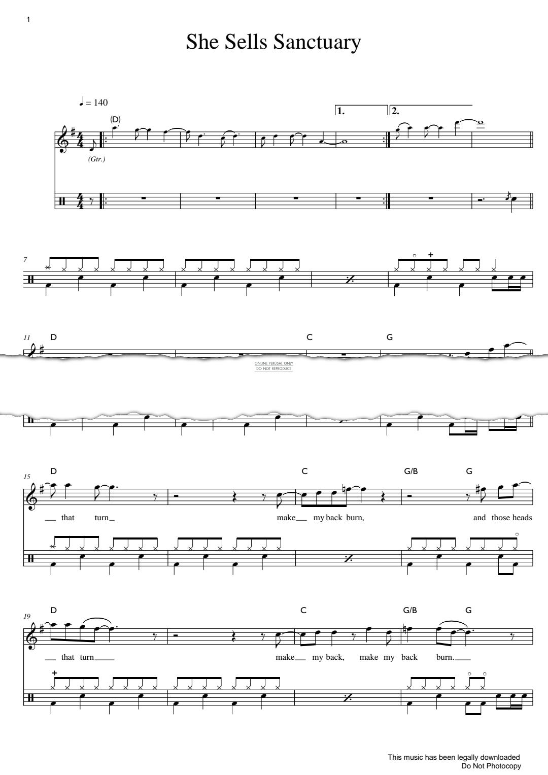 She Sells Sanctuary, as recorded by The Cult. Arranged for voice with drums in digital sheet music format.