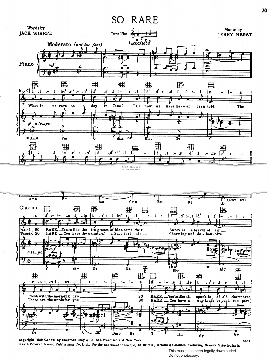 So Rare written by Jerry Herst with words by Jack Sharpe, as performed by Ella Fitzgerald in the key of C Major arranged for voice and piano with guitar chords.