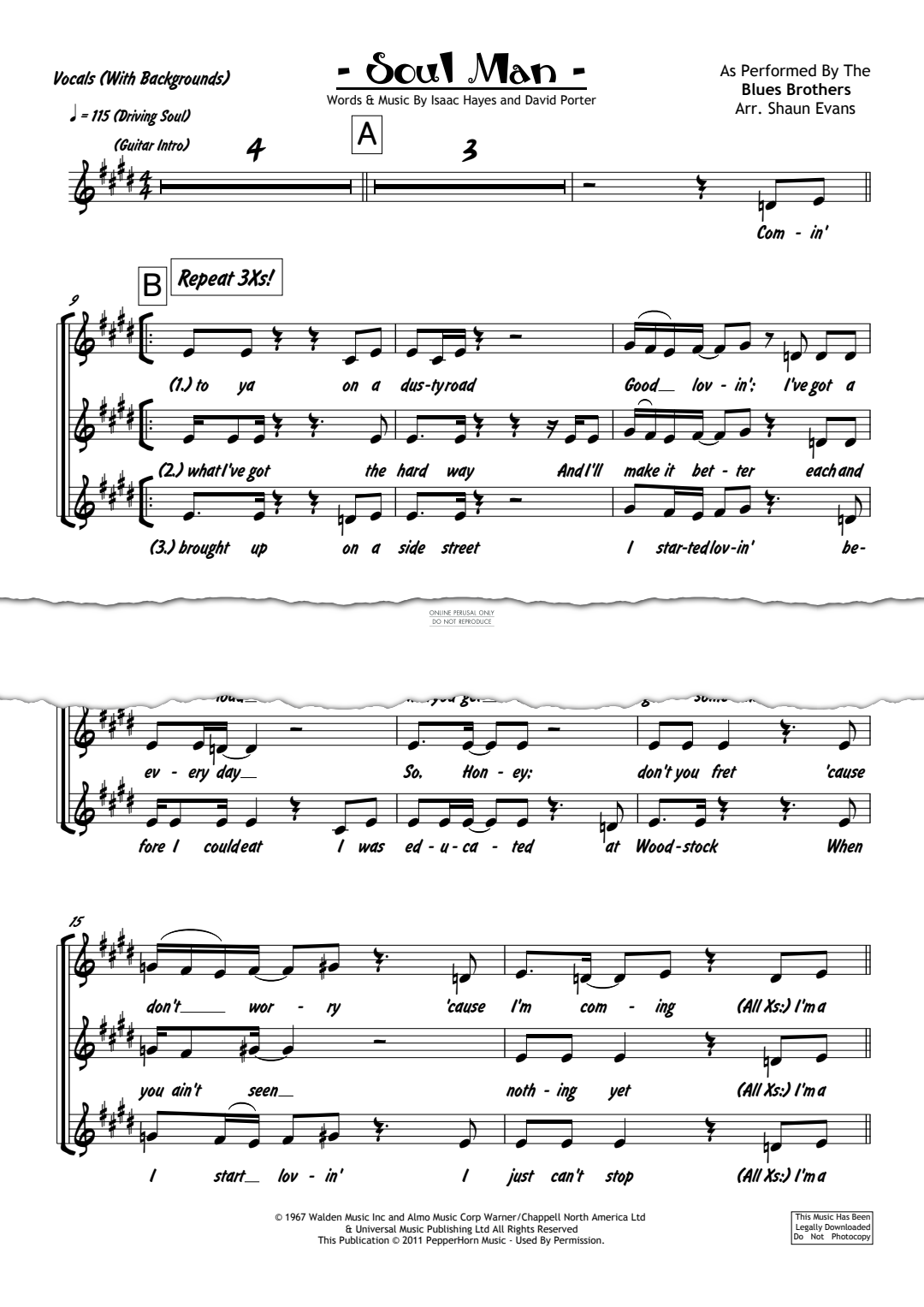 The Blues Brothers captured this Sam & Dave soul classic on SNL in 1978 and revisited the groovy number on their 'Breifcase Full Of Blues' tour and album.  Written by Stax Records' hitmaking duo of Isaac Hayes and David Porter hit the record stands in 1967 and was an immediate hit.  This soul anthem has been professionally arranged for 6 Horns (Trumpet I & II, Alto, Tenor & Bari Sax, Trombone), 4 Rhythm (Drums, Guitar, Bass, Keys), Vocals and Background Vocals by Shaun Evans.  It is presented as part of the PepperHorn Collections series from PepperHorn Music.