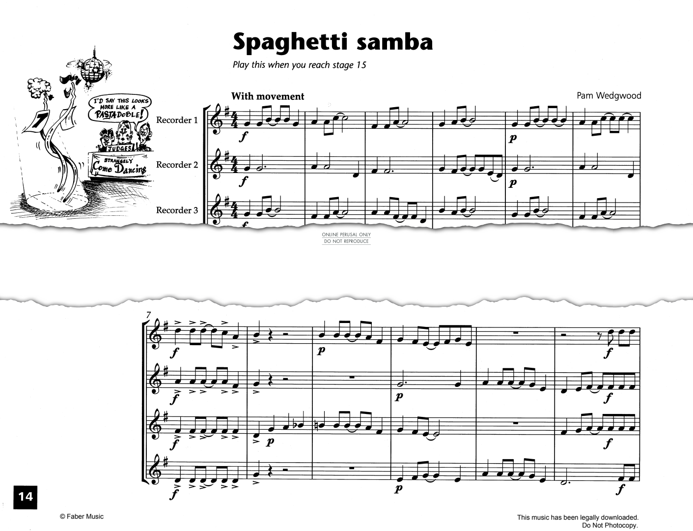 Spaghetti Samba, written by Pam Wedgwood. Arranged for recorder quartet in digital sheet music format.