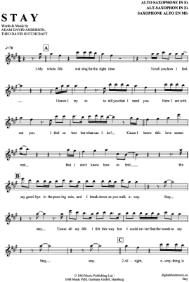 Stay - Sheet Music for Alto Saxophone Hurts