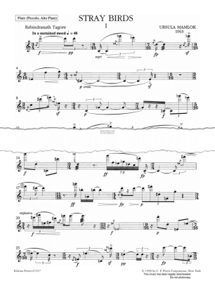 The full score and parts to Stray Birds, composed by Ursula Mamlok for soprano, flute (piccolo, alto flute) and violoncello in digital sheet music format [EP7257].