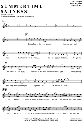 Summertime Sadness - Sheet Music for recorder Lana del Rey