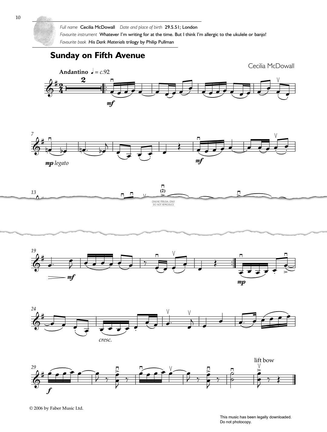 Sunday On Fifth Avenue, composed by Cecilia McDowall and arranged for violin with piano accompaniment. Taken from FingerPrints, 14 easy contemporary pieces for violin.