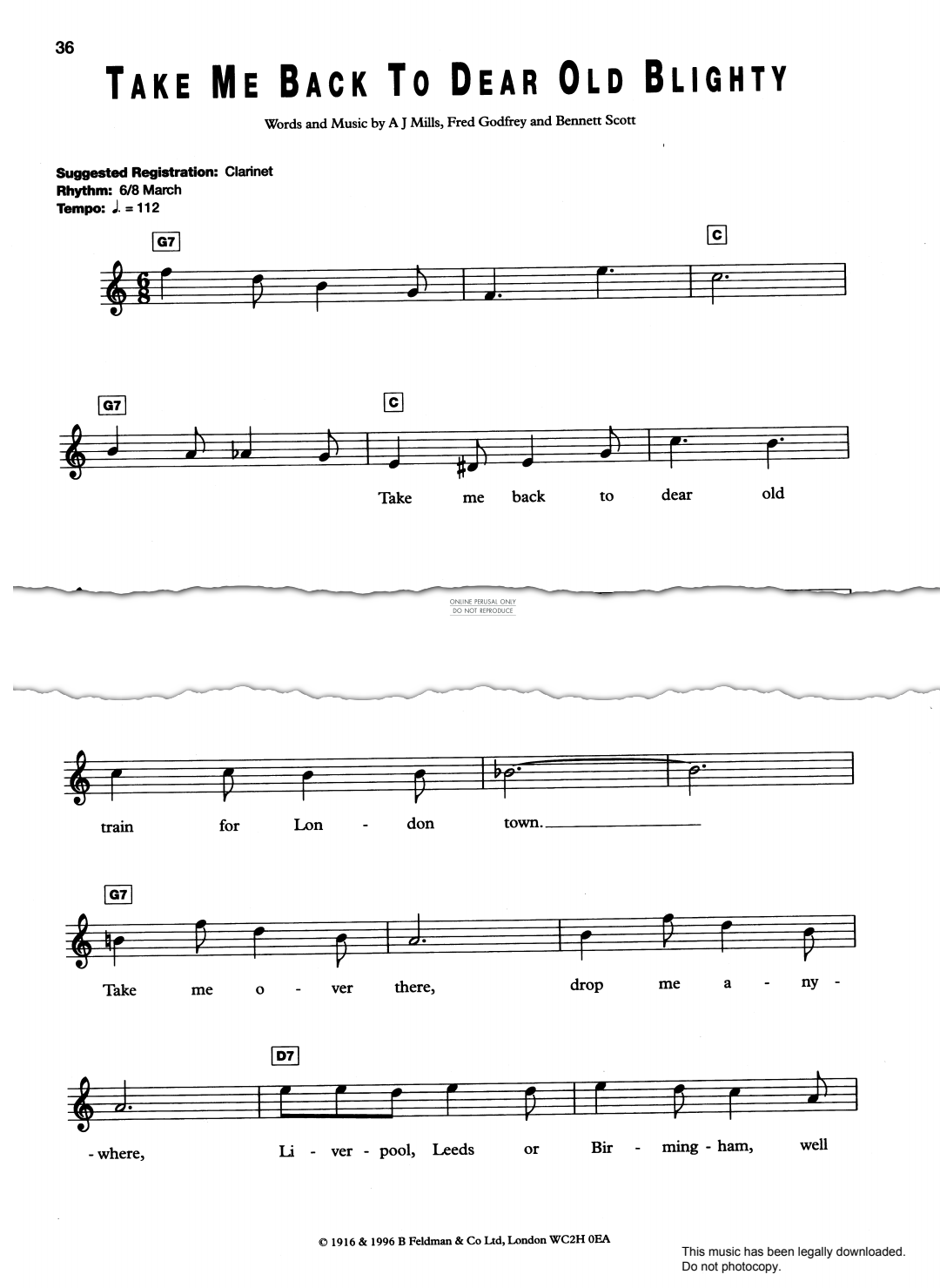 Take Me Back To Dear Old Blighty, a war song, composed by A.J. Mills, Fred Godfrey and Bennett Scott in the key of C Major arranged for voice and keyboard.