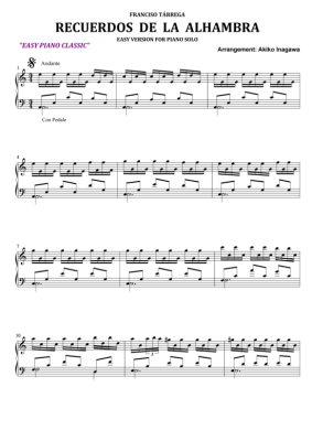 Tarrega Recuerdos De La Alhambra - Sheet Music for Klavier Solo easy Francisco Tarrega, Akiko Inagawa/Arr.