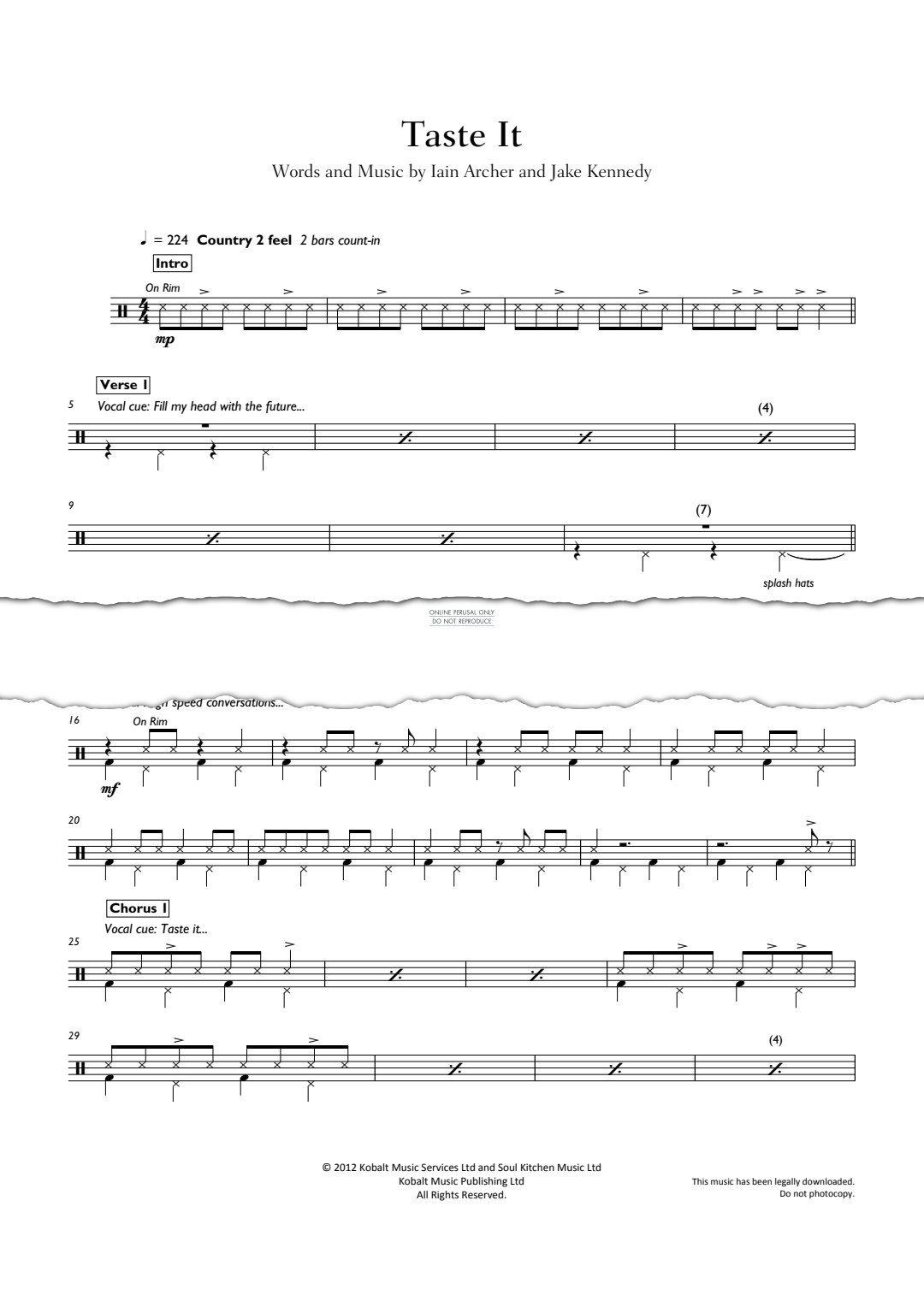 Taste It by Jake Bugg, arranged in drum chart format to follow the parameters for Grades 4 to 5 as set out by Trinity for the βown choice songβ option in their Rock & Pop exams.