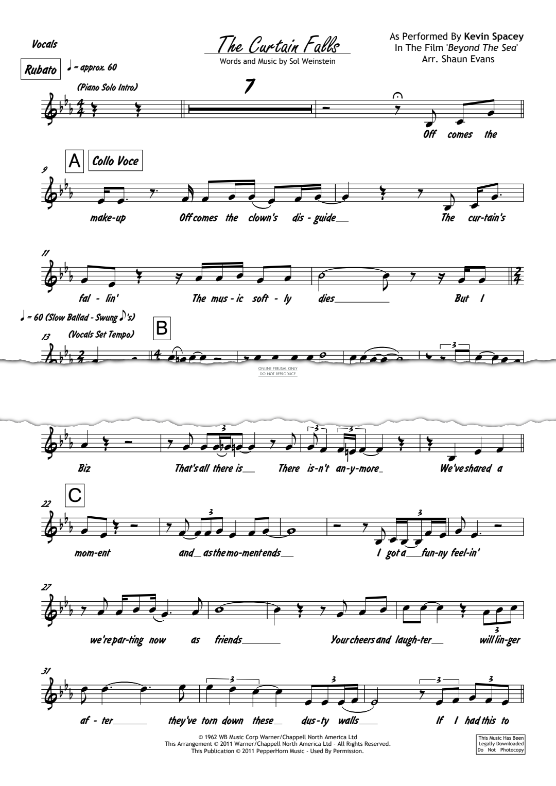 The Curtain Falls' is a moving ballad by Sol Weinstein, as sung by the great Bobby Darin. The song is the first person introspection of a life on stage and giving one's self to the audience night after night. This particular version was taken from Kevin Spacey's portrayal of Bobby D. in the film 'Beyond The Sea'. This chart has been professionally scored for 2 Horn (Trumpet, Tenor Sax), 4 Rhythm (Drums, Guitar, Bass, Keyboards) and Vocals by Shaun Evans. It is presented as part of the PepperHorn Collections series from PepperHorn Music.
