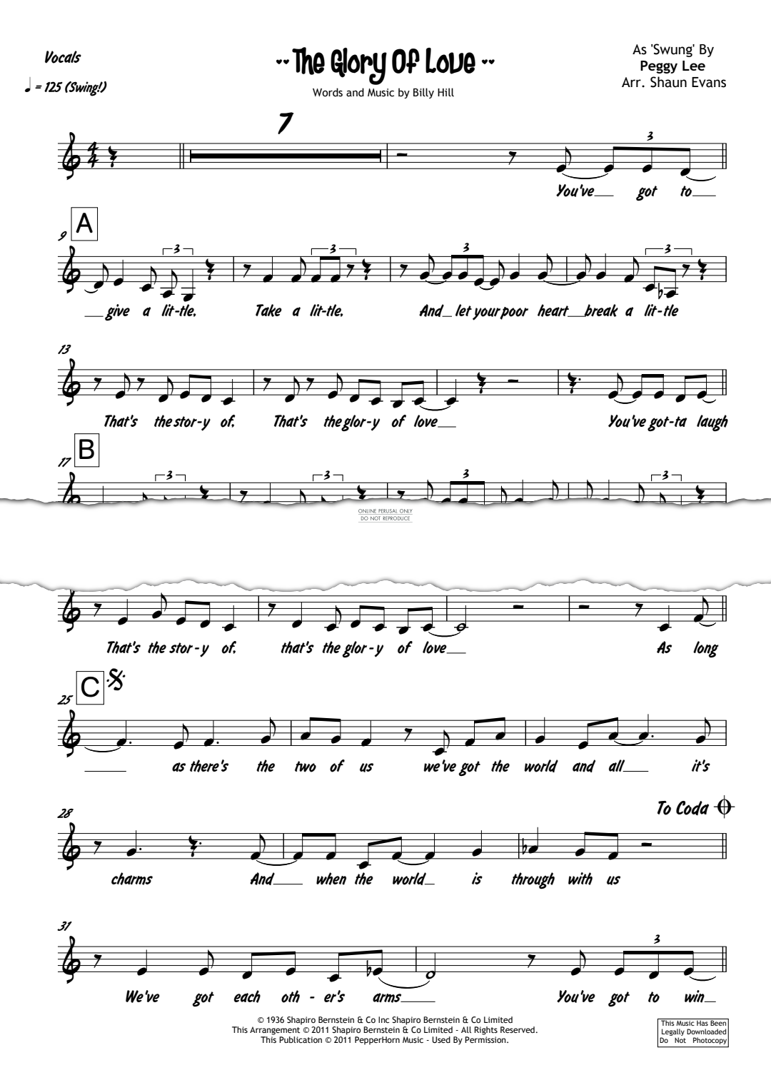 The Glory Of Love - Sheet Music for Peggy Lee