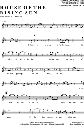 The House Of The Rising Sun - Sheet Music for Tenor Saxophone The Animals