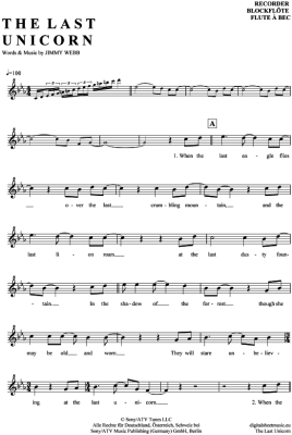 The Last Unicorn - Sheet Music for recorder Das letzte Einhorn (Filmmusik, 1982)