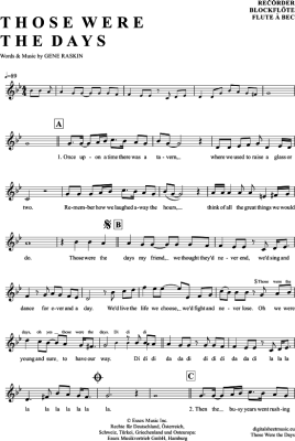 Those were the days - Sheet Music for recorder Mary Hopkin (VA)