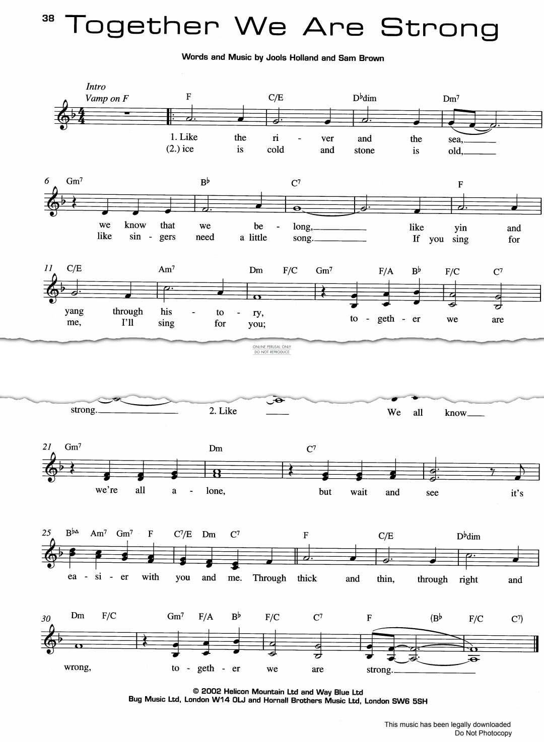 Together We Are Strong, as recorded by Jools Holland and Sam Brown. Arranged for melody line with guitar chords in digital sheet music format.