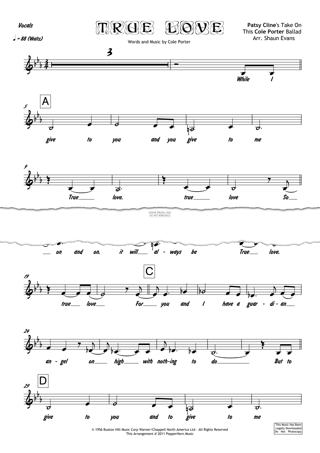 This beautiful Cole Porter waltz is a great love ballad from his musical 'High Society'.  Patsy's take was realeased on her 1961 album 'Showcase' and is a perfect example why Patsy was queen on the Ballads.  This song is as at home at a society ball or your local bar gig - a perfect chance for dancers to get close.  This chart has been professionally arranged for 4 Horns (Trumpet, Alto & Tenor Sax, Trombone), 4 Rhythm (Drums, Guitar, Bass, Keyboards), Vocals and Background Vocals by Shaun Evans.  It is presented as part of the PepperHorn Collections series from PepperHorn Music.