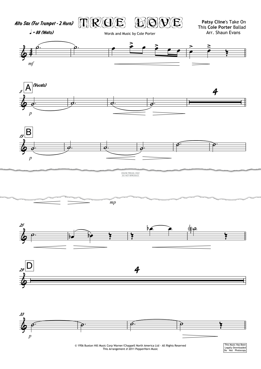 This is an Alto Sax part to replace Trumpet for the 2 Horn arrangement of 'True Love' by Patsy Cline, presented by PepperHorn Music.