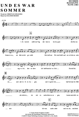Und es war Sommer - Sheet Music for recorder Peter Maffay