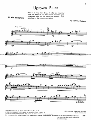 Uptown Blues written by Johnny Hodges, from the Sax Originals album arranged for Eb Alto Saxophone and piano. Uptown Blues, play as a very slow drag. A solid but mournful tone will enhance the occasional dissonant passages and bring out the feeling of "lament" characteristic of the entire composition.