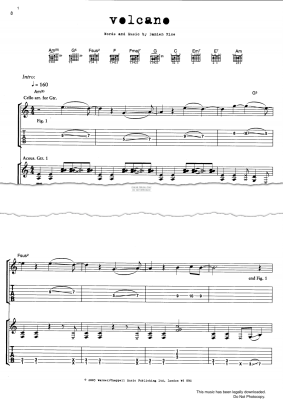 Volcano, by Damien Rice. Arranged for guitar tablature and voice in digital sheet music format.