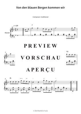 Dieses Notenheft enthΓ€lt die Originalnoten zum Kinderlied "Von den blauen Bergen kommen wir" fΓΌr Klavier. Leichter Schwierigkeitsgrad in F-Dur.