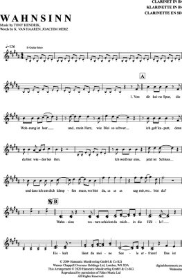 Wahnsinn - Sheet Music for Clarinet in B-flat Wolfgang Petry