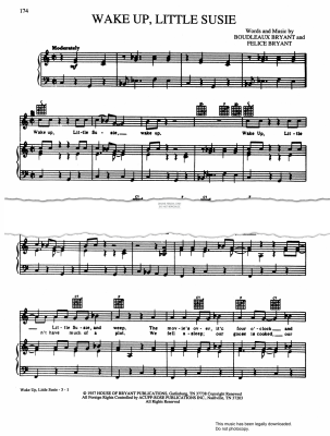 Wake Up, Little Susie, as performed by The Everly Brothers, arranged for voice and piano with guitar chords.