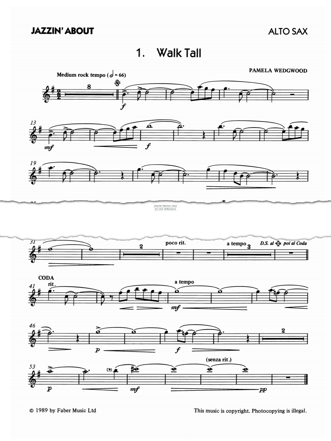 Walk Tall, written by Pam Wedgwood for alto saxophone and piano accompaniment in digital sheet music format.