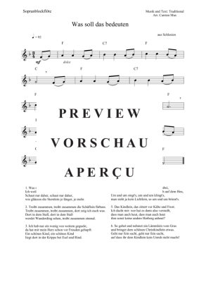 Was soll das bedeuten, ist ein Kirchenlied aus Schlesien, das man heute zu Weihnachten spielt und singt. Eine leichte Version für den fortgeschrittenen Anfänger . Dazu Atemzeichen, Dynamikzeichen, die Akkordsymbole für ein Begleitinstrument in C und 6 Liedstrophen zum Mitsingen.
