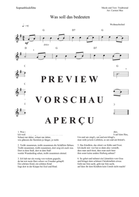 Was soll das bedeuten, ist ein Kirchenlied aus Schlesien, das man heute zu Weihnachten spielt und singt. Eine leichte Version für den fortgeschrittenen Anfänger . Dazu Atemzeichen, Dynamikzeichen, die Akkordsymbole für ein Begleitinstrument in C und 6 Liedstrophen zum Mitsingen.