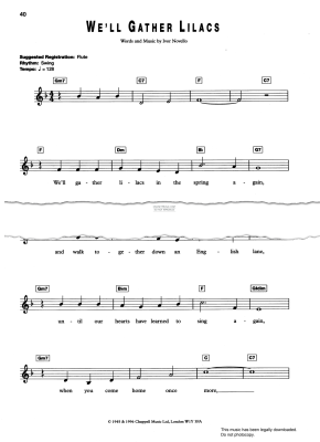 We'll Gather Lilacs, from the musical Perchance To Dream, composed by Ivor Novello in the key of F Major arranged for voice and keyboard.