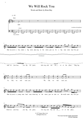 We Will Rock You, as performed by Queen, from their sixth studio album News Of The World (1977), written by Brian May, arranged for guitar tablature and vocals and available to print instantly at home in digital sheet music format. Official, artist-approved.
