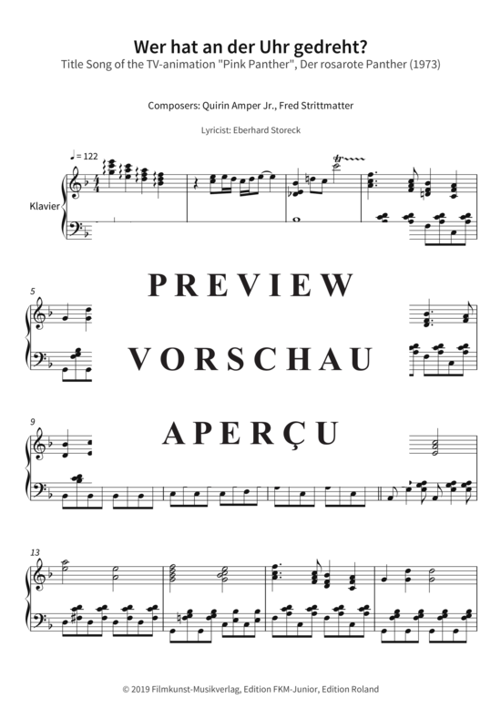 Dieses Notenheft enthält die Originalnoten zum Kinderlied "Wer hat an der Uhr gedreht? - Title Song of the TV-animation "Pink Panther", Der rosarote Panther (1973)" für Klavier. Mittlerer Schwierigkeitsgrad in G-Dur.