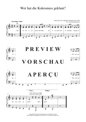 Wer hat die Kokosnuss geklaut (Die Affen rasen durch den Wald) - Sheet Music for Piano Easy mündlich überliefert (Klaviersatz: Jan-Frerk Burmester)