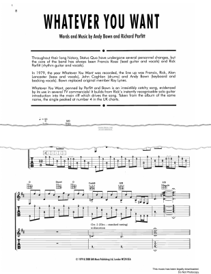 Whatever You Want, as recorded by Status Quo. Arranged for voice with guitar tablature in digital sheet music format.