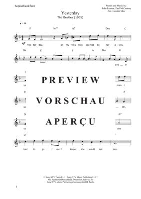 Yesterday (1965) - Sheet Music for Soprano Recorder Solo The Beatles