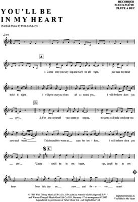 You´ll be in my heart - Sheet Music for recorder Phil Collins