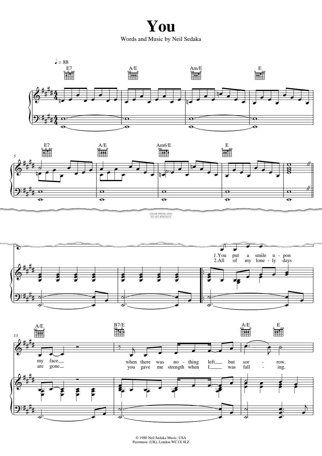 You, by Neil Sedaka. Arranged for piano and voice with guitar chords in digital sheet music format.