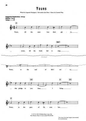 Yours, a war song, composed by Gonzalo Roig, with words by Augustin Rodriguiez and English words by Jack Sherr in the key of F Major arranged for voice and keyboard.