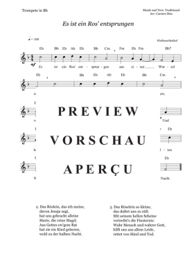 Es ist ein Ros´ entsprungen ist ursprünglich ein kirchliches Weihnachtslied aus dem 16. Jahrhundert. Das Weihnachtslied ist für den fortgeschrittenen Trompeter als Vorspiel oder Übungsstück bestens geeignet. Dazu 3 Liedstrophen zum Mitsingen. Die Akkordsymbole sind für ein Begleitinstrument in C entsprechend angepasst. (F - dur)