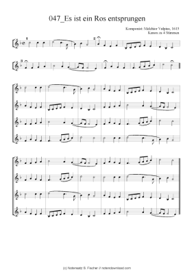 Es ist ein Ros entsprungen - Noten für Quartett in C Melchior Vulpius, 1615 Kanon zu 4 Stimmen