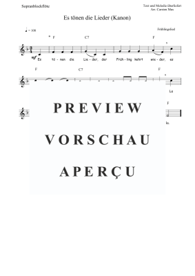 Es tönen die Lieder (Kanon) - Noten für Sopran Blockflöte Solo und Akkorde Traditional