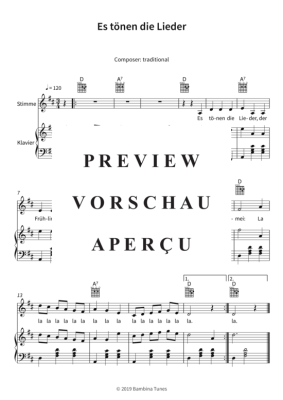 Dieses Notenheft enthält die Originalnoten zum Kinderlied "Es tönen die Lieder" für Klavier, Gesang und Gitarre. Leichter Schwierigkeitsgrad in D-Dur mit Liedtext.