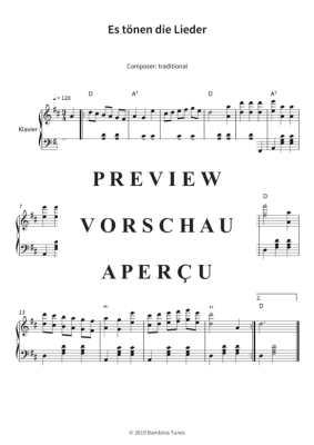 Dieses Notenheft enthält die Originalnoten zum Kinderlied "Es tönen die Lieder" für Klavier. Leichter Schwierigkeitsgrad in D-Dur.