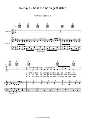 Fuchs, du hast die Gans gestohlen - Noten für Gesang + Klavier, Gitarre traditional