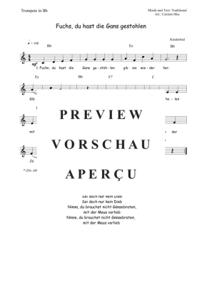 Fuchs du hast die Gans gestohlen. Ein sehr bekanntes Kinderlied unserer Zeit für den leicht fortgeschrittenen Trompeter.