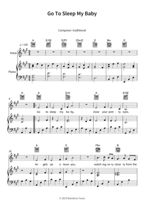 Dieses Notenheft enthält die Originalnoten zum Kinderlied "Go To Sleep My Baby" für Klavier, Gesang und Gitarre. Leichter Schwierigkeitsgrad in A-Dur mit Liedtext.