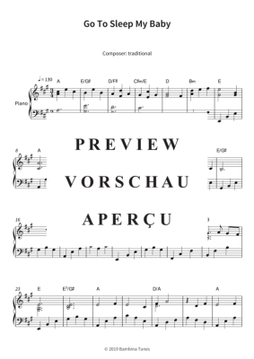 Dieses Notenheft enthält die Originalnoten zum Kinderlied "Go To Sleep My Baby" für Klavier. Leichter Schwierigkeitsgrad in A-Dur.