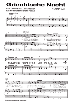 Griechische Nacht - Noten für Klavier und Gesang Bernhard Brink