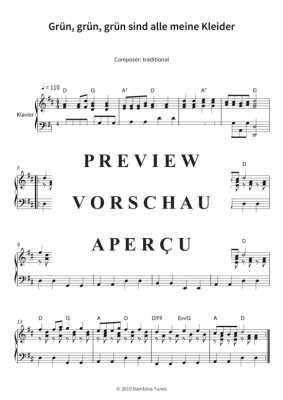 Dieses Notenheft enthält die Originalnoten zum Kinderlied "Grün, grün, grün sind alle meine Kleider" für Klavier. Leichter Schwierigkeitsgrad in D-Dur.